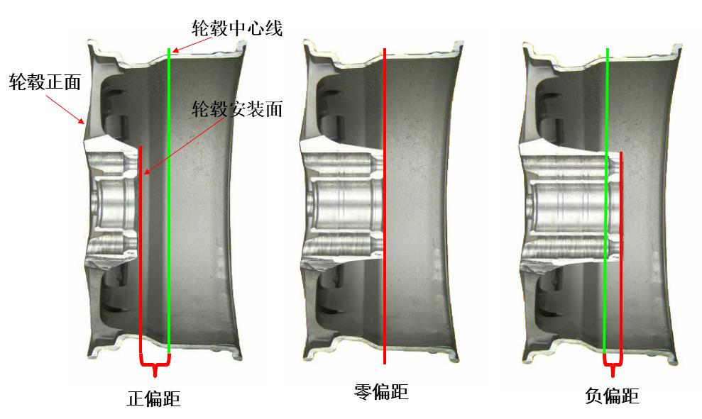 正偏距:以轮毂中心线为分界,轮毂安装面在更靠近轮毂正面一侧(即靠近车身外侧)