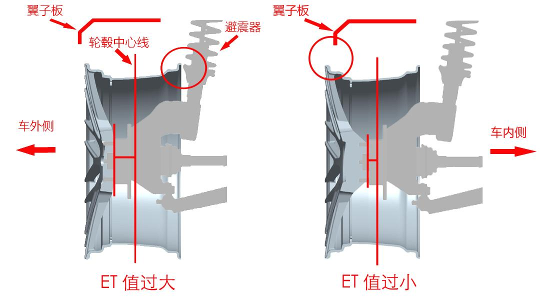 - 轮毂ET值过小:轮毂凸出车身容易与翼子板干涉。